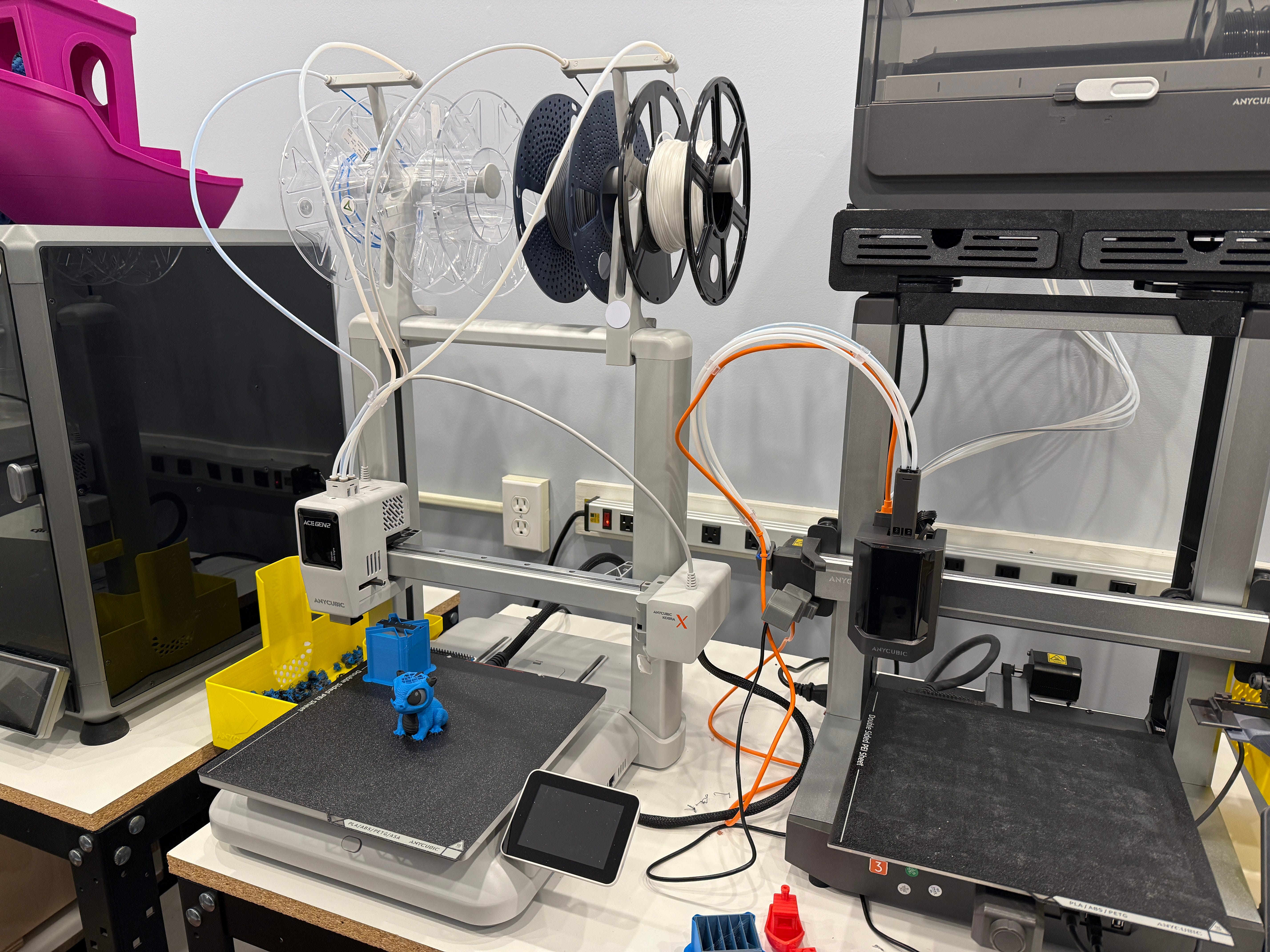 This is a color-switching printer, but there’s no special separate filament holding box (like the one you can see above the Anycubic Kobra 3 on the right). Instead, the entire color-switching apparatus is built into the print head. It’s an interesting approach, even if there’s a wild mess of feed tubes exploding from the top of the machine.