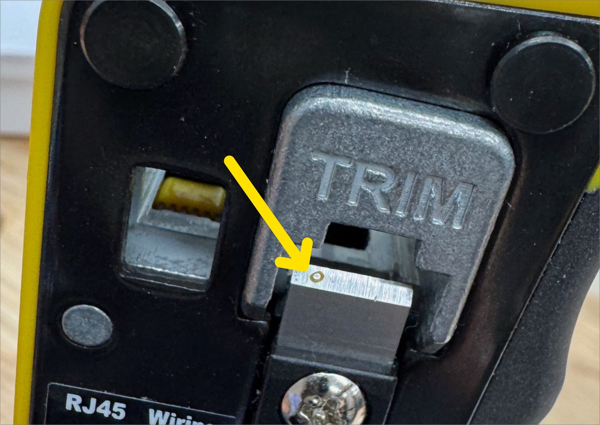 We were out of ideas. We thought of buying another crimping tool. But Denise noticed a tiny little circle near the tool’s blade, where it cuts off the excess wire.