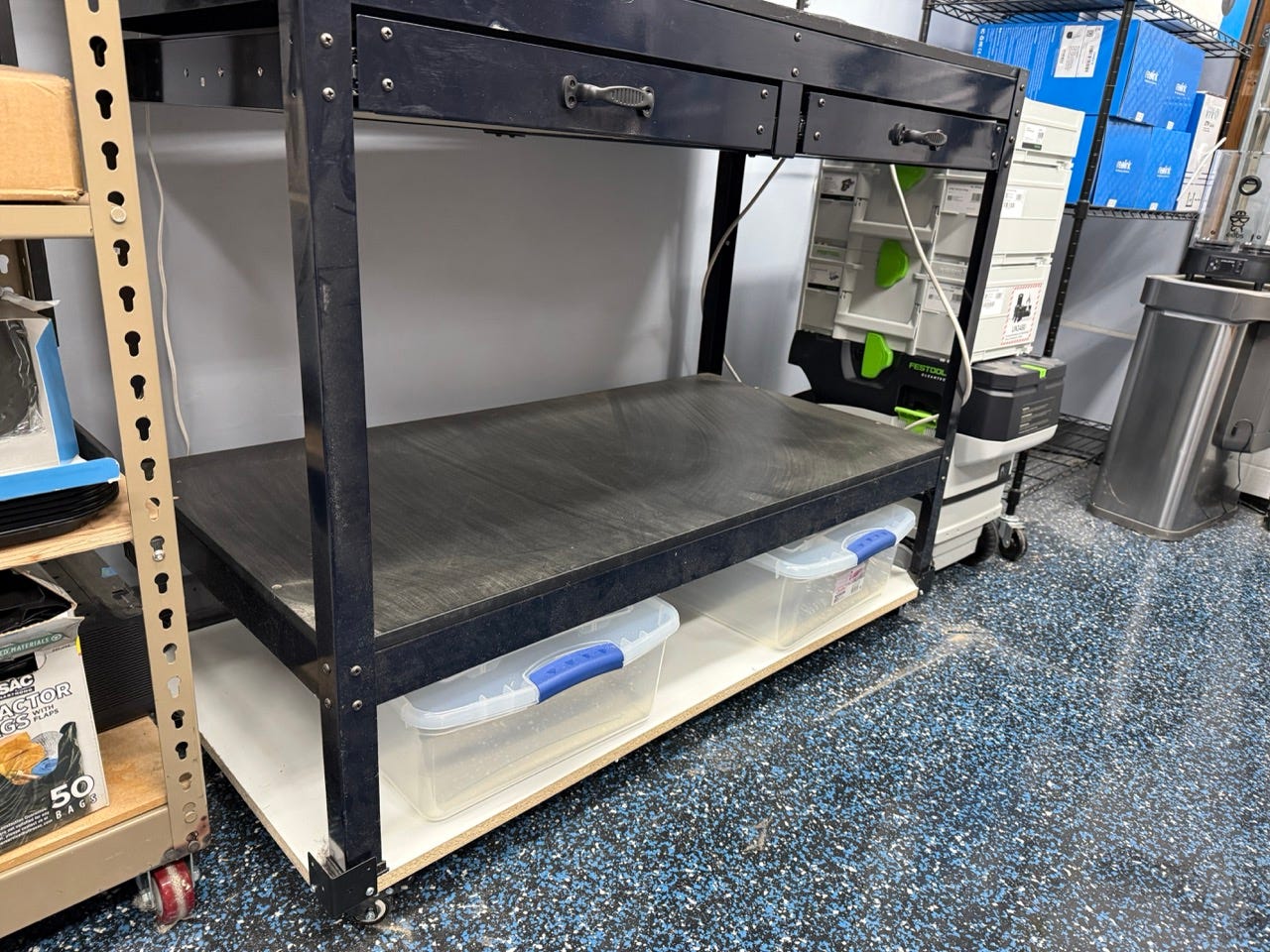This project was very easy. For each workbench, I took a 2x4 foot Melamine project board from Home Depot and attached six casters. I bought three sets of four, so that I could have one on each corner and two in the middle (just because the span is a bit long and melamine project panels aren’t as robust as plywood). The benches mostly stay in place due to their weight, but to prevent them from sliding off, I added a heavy duty steel L bracket on each corner.