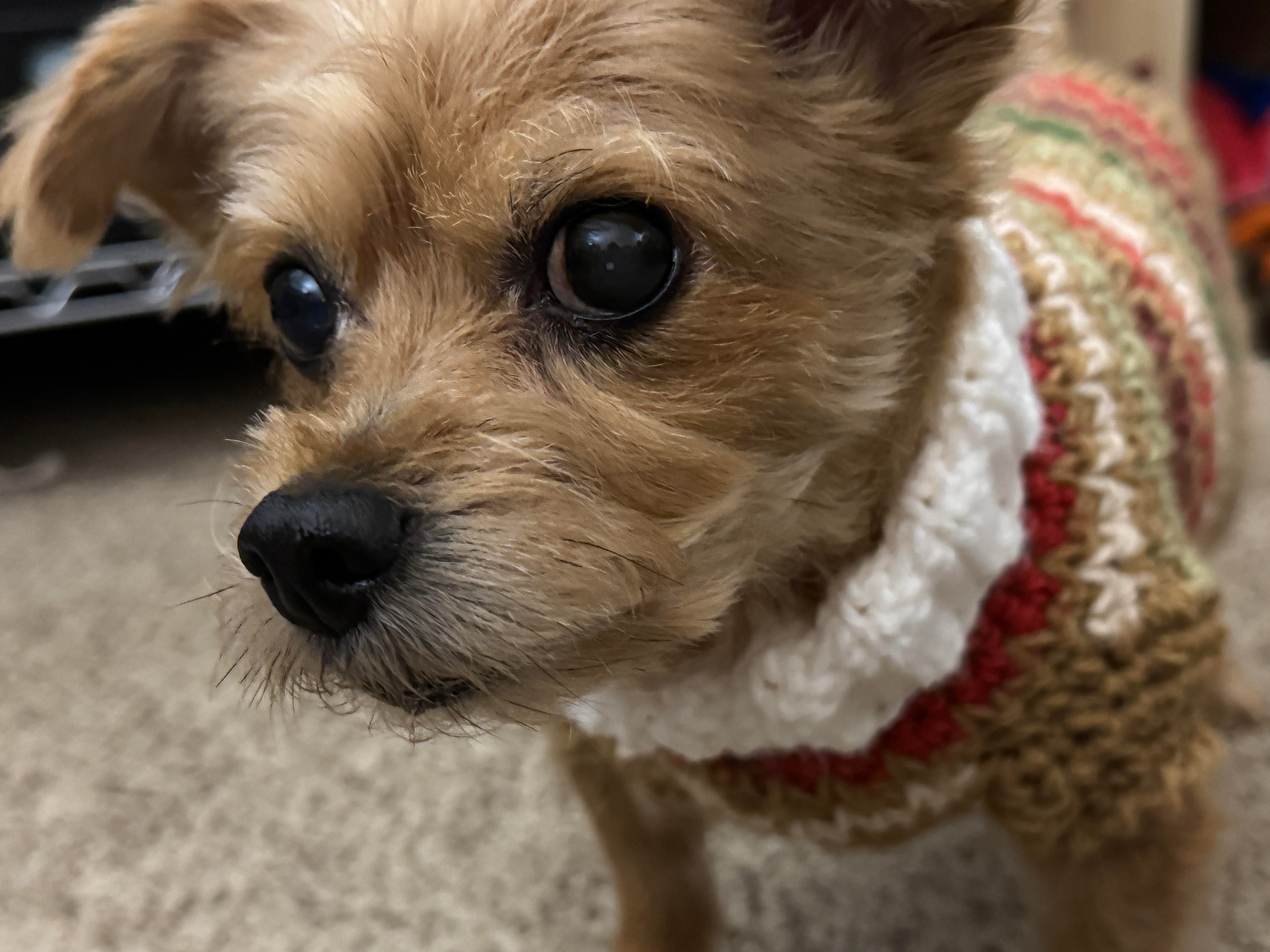 It’s been cold here in Oregon, so my wife has been crocheting Pixel a bunch of awesome (and warm) sweaters. Here, the little dude models one of his favorites.