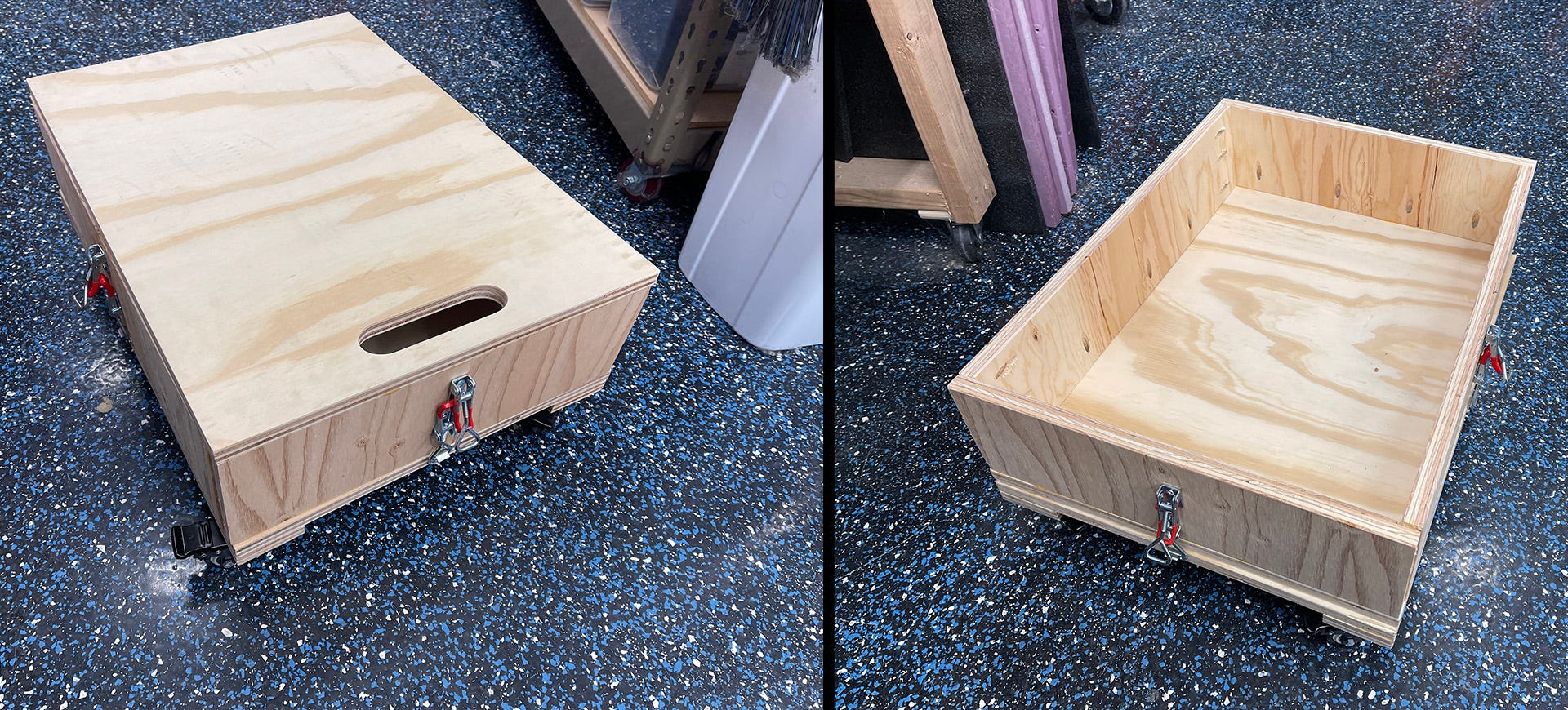 I, however, wanted to make something that just perfectly fits my Fab Lab carts, so I can easily slide heavy gear onto and off of the lower shelves of the carts. I also wanted to use it just as a dolly, and as a little mobile wagon. So I made the mobile dolly base and the apple box separately, then used the little toggle clamps to enable the modules to be attached together in both orientations.